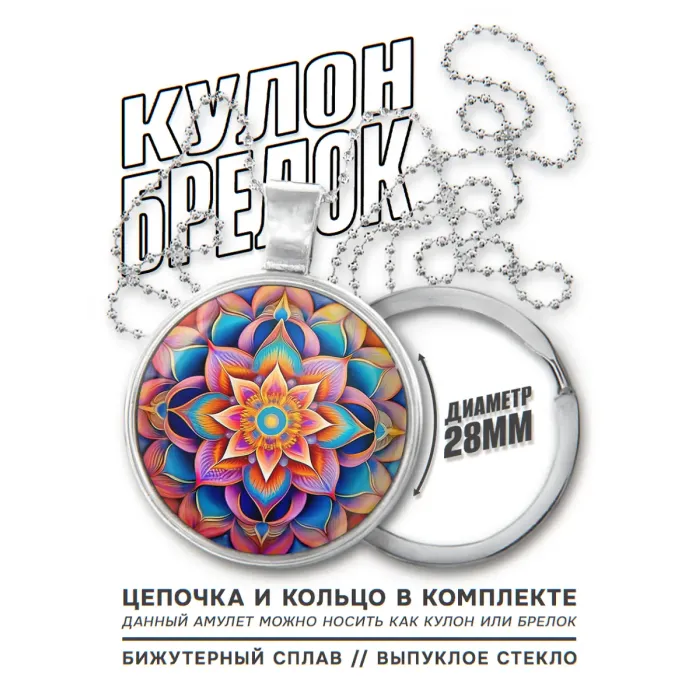 Размеры и комплектация: Диаметр кулона 28 мм. В комплекте цепочка, кольцо. Упаковка — полипропиленовый пакет.