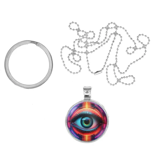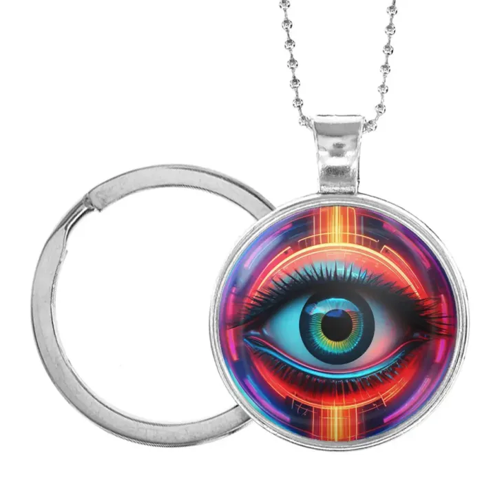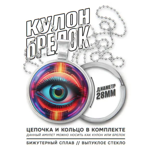Сувенирный кулон-брелок в виде глаза с неоновым акцентом. Изделие выполнено из бижутерного сплава с серебристым покрытием.