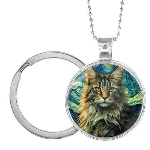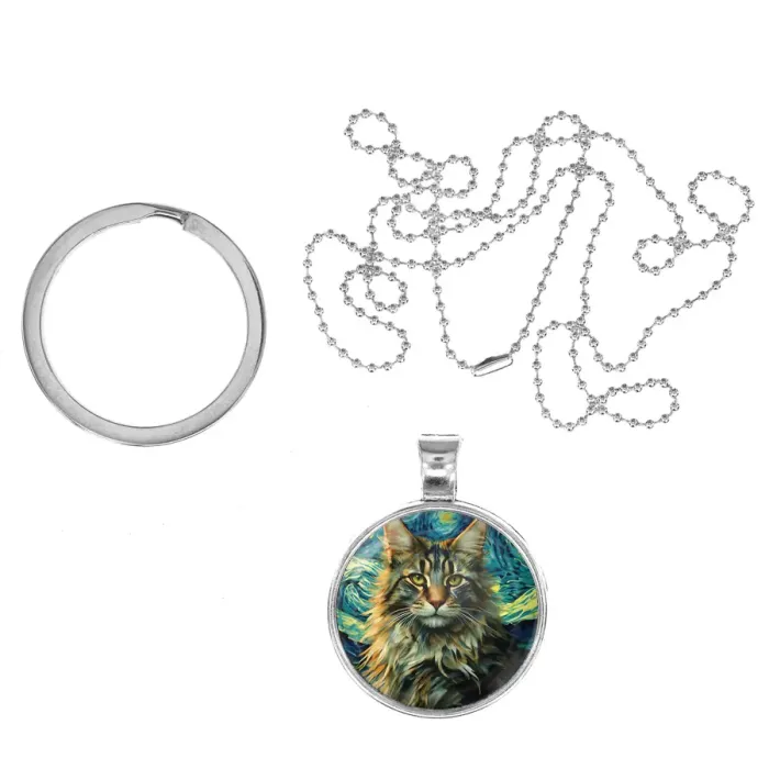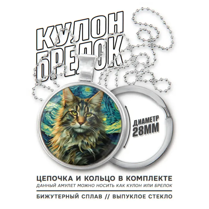 Кулон-брелок с изображением длинношёрстного кота на фоне звёздной ночи.