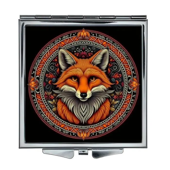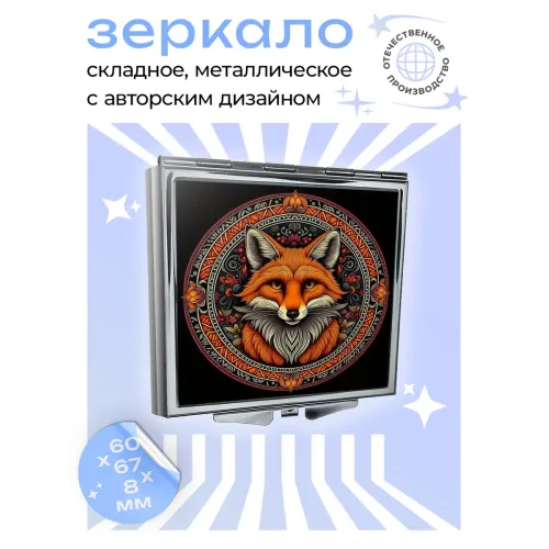Складное зеркало квадратной формы с полноцветным изображением лисы на металле.