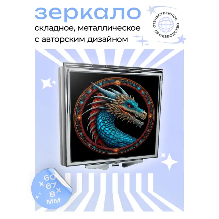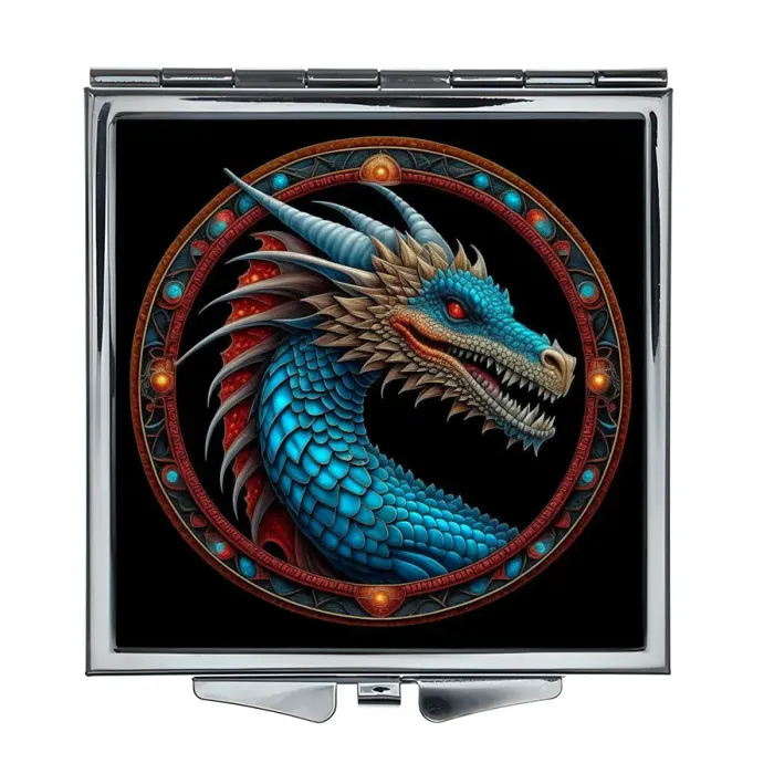 Складное зеркало квадратной формы с изображением дракона голубого цвета.