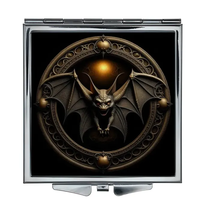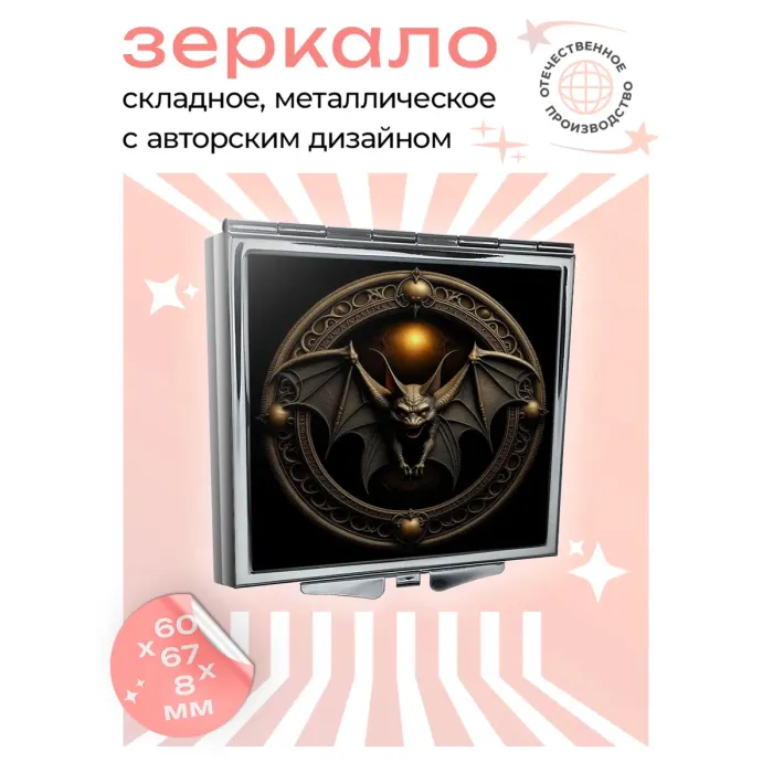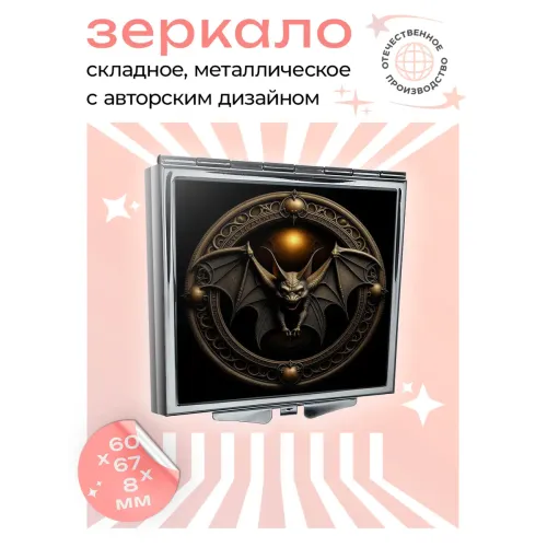 Складное зеркало квадратной формы для личного использования. Материал: металл и стекло. Дизайн с полноцветной печатью изображения летучей мыши.