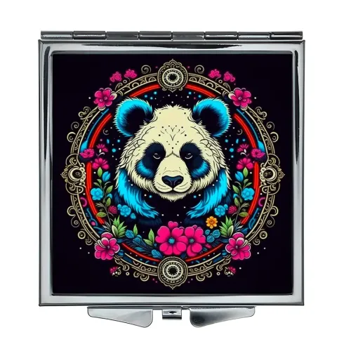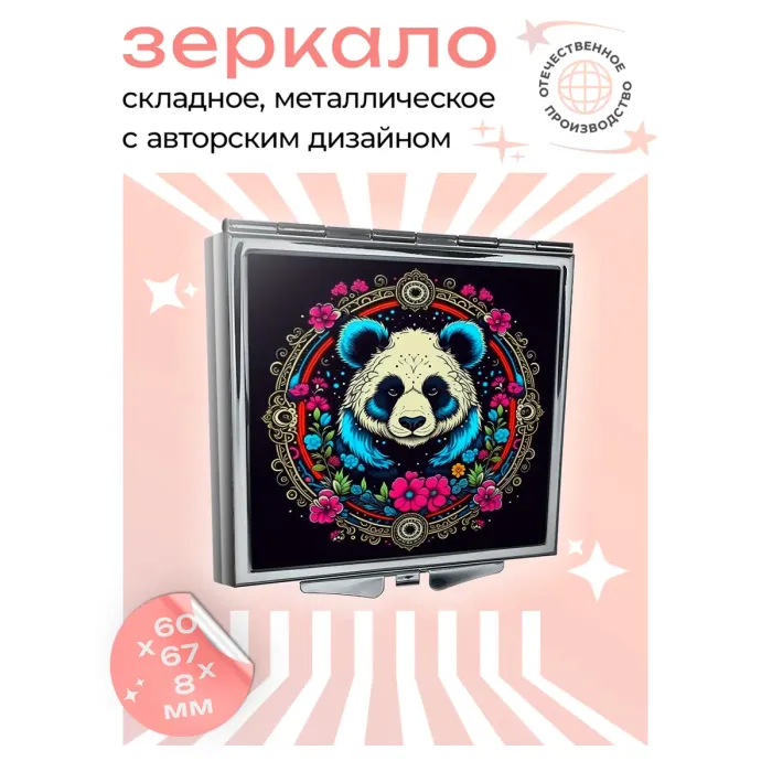 Складное зеркало квадратной формы с изображением панды и цветов. Изготовлено из металла и стекла.