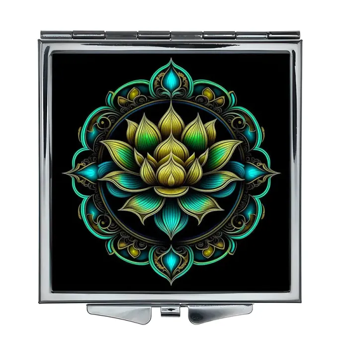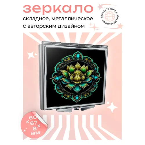 Складное зеркало квадратной формы с изображением синего лотоса. Изготовлено из металла и стекла.