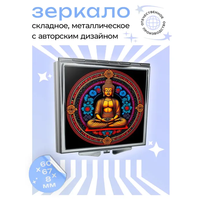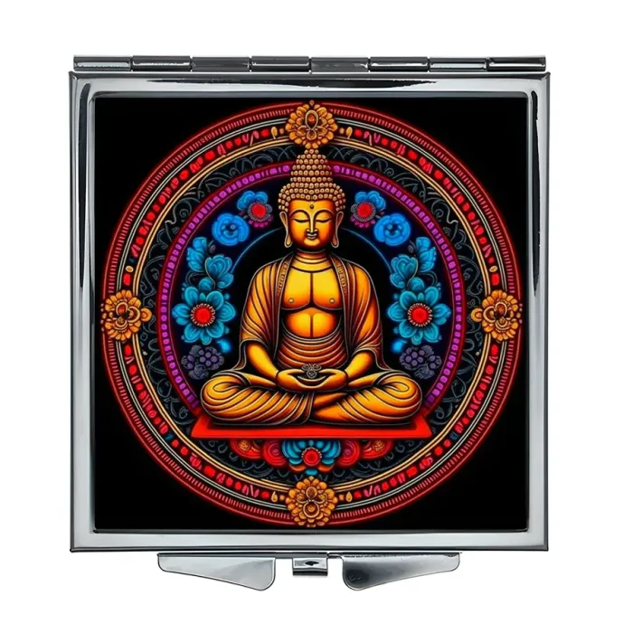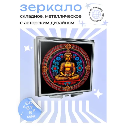 Складное квадратное зеркало с изображением Будды и цветов. Материал: металл и стекло.