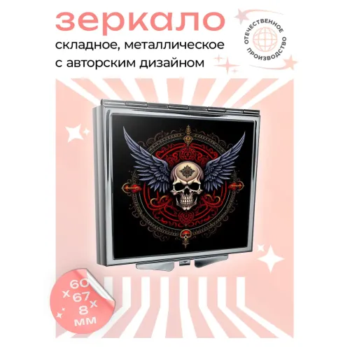 Складное квадратное зеркало с полноцветным изображением крылатого черепа.