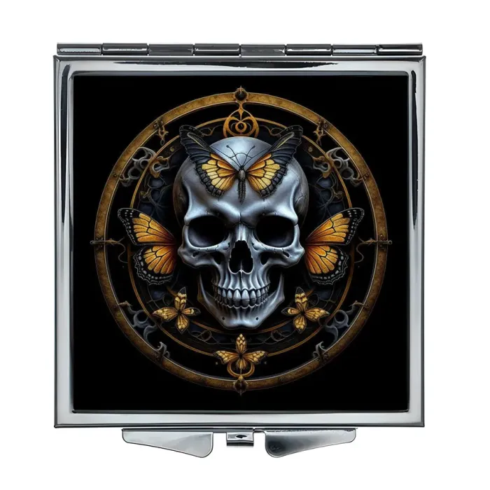 Складное зеркало квадратной формы с изображением черепа и бабочек.