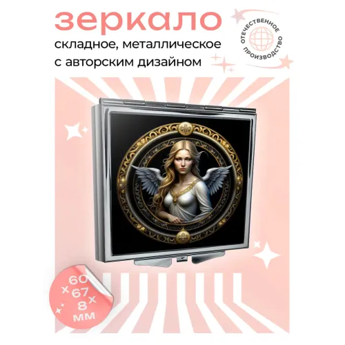 Складное зеркало квадратной формы с изображением ангела. Изготовлено из металла и стекла.