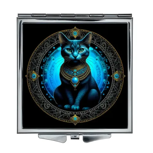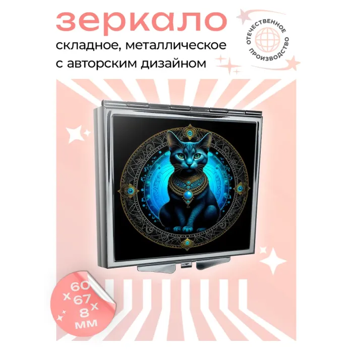 Складное зеркало квадратной формы для личного использования, изготовленное из металла и стекла, с полноцветной печатью изображения кошки.