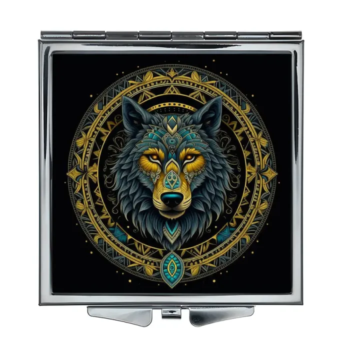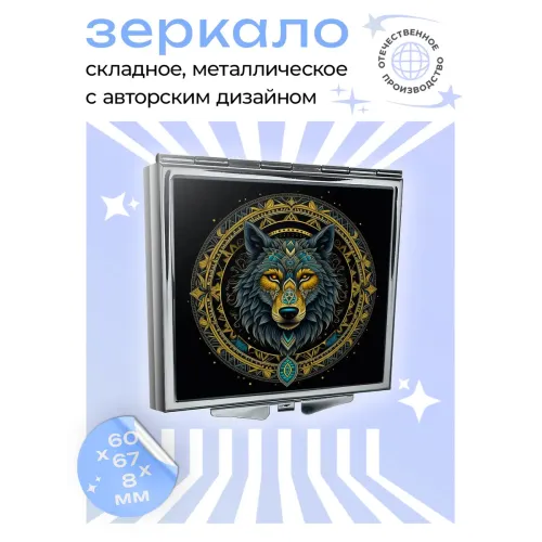 Складное зеркало квадратной формы с изображением волка. Материал: металл и стекло.