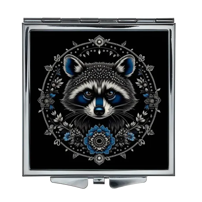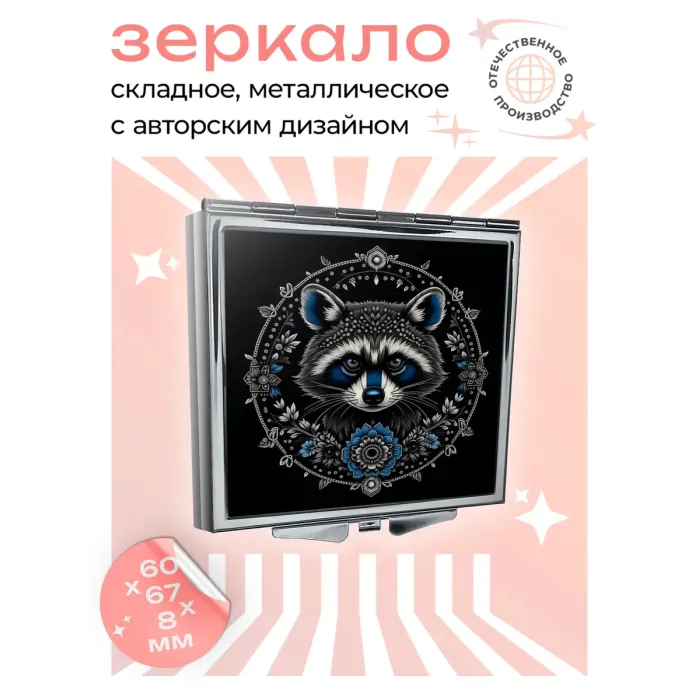 Складное зеркало квадратной формы с изображением енота. Материалы: металл и стекло.