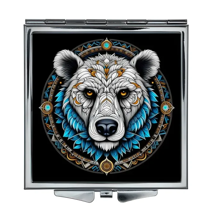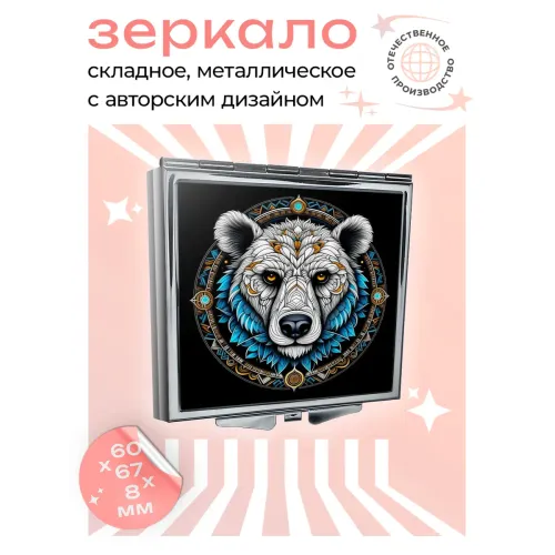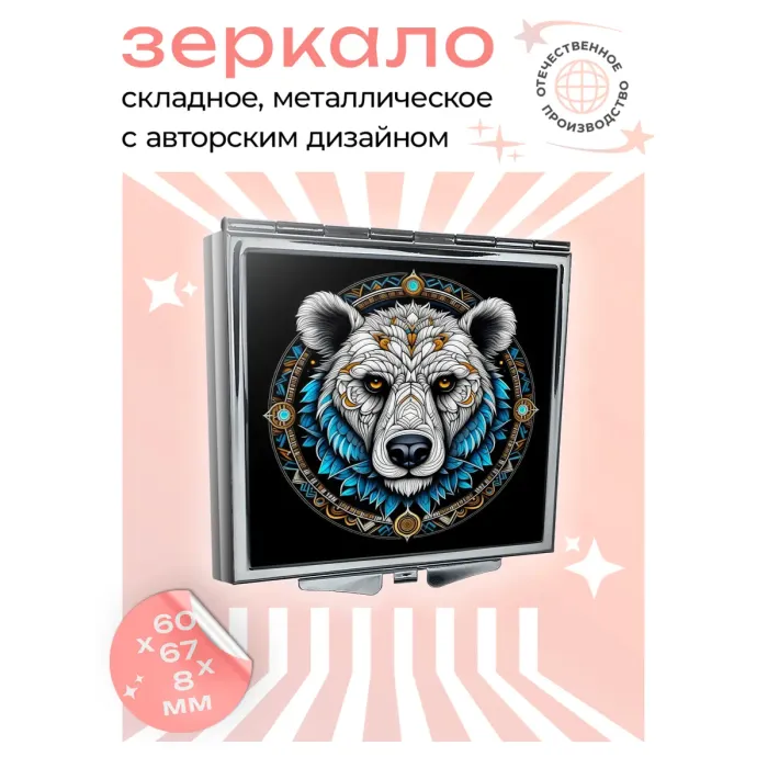 Складное зеркало квадратной формы с изображением белого медведя. Изготовлено из металла и стекла.