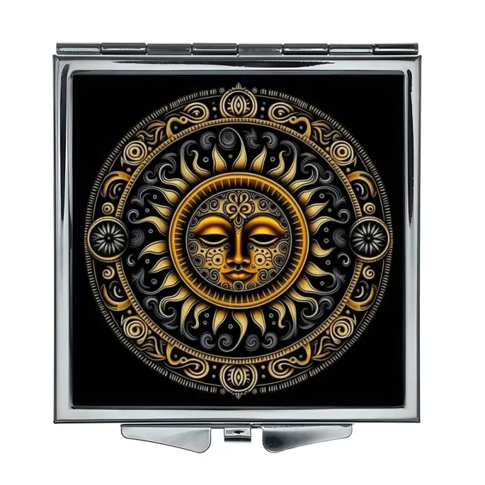 Складное зеркало квадратной формы с изображением Солнца. Изготовлено из металла и стекла.