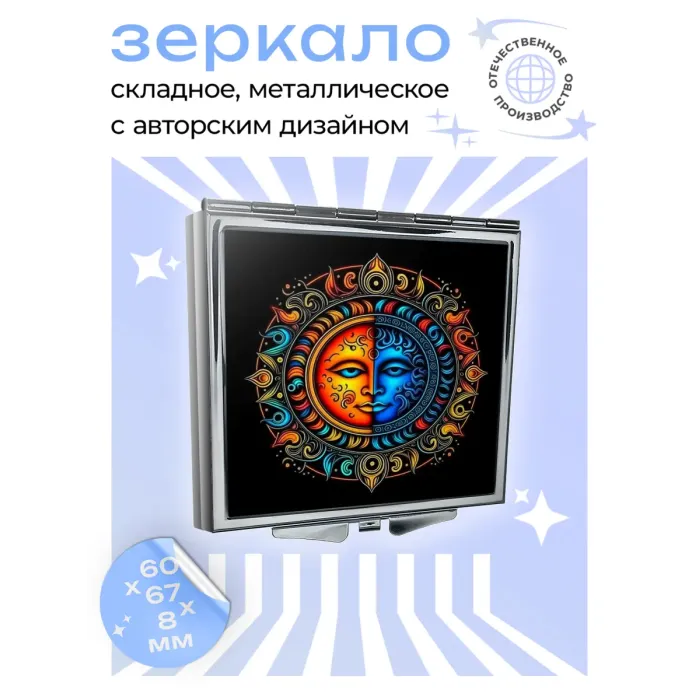 Складное зеркало квадратной формы для личного использования. Изготовлено из металла и стекла, украшено полноцветной печатью с изображением Солнца и символа Инь-Ян.