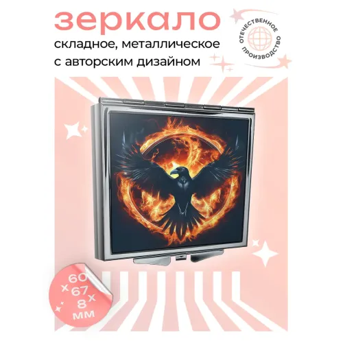 Складное зеркало квадратной формы с изображением Огненного ворона. Материалы: металл и стекло.