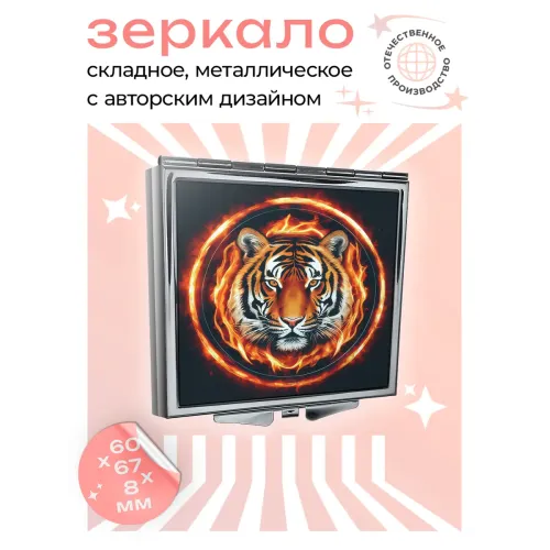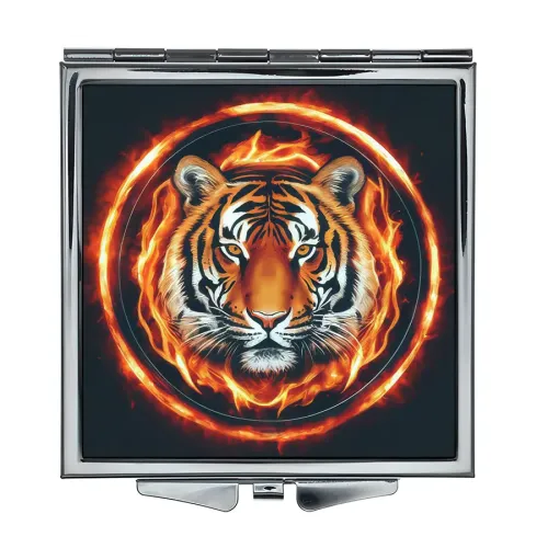 Складное зеркало квадратной формы с изображением Огненного тигра. Изготовлено из металла и стекла с полноцветной печатью.