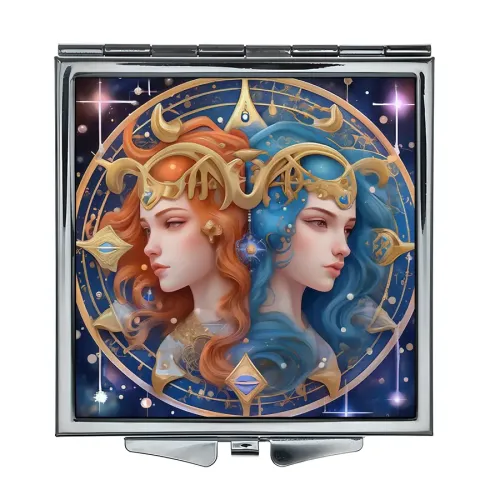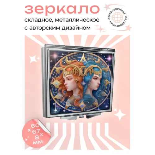Складное квадратное зеркало с изображением знака зодиака Близнецы. Сувенирный аксессуар из металла и стекла.