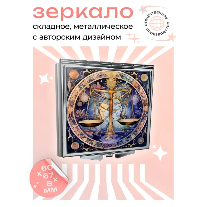 Складное зеркало с изображением знака зодиака Весы. Изготовлено из металла и стекла с полноцветной печатью.