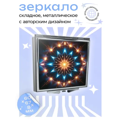 Складное квадратное зеркало с изображением магического символа, выполнено из металла и стекла.