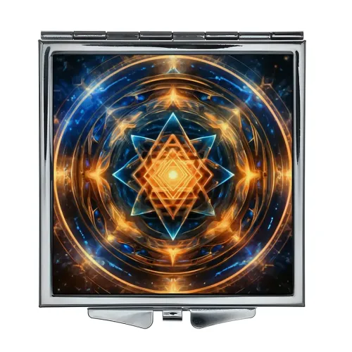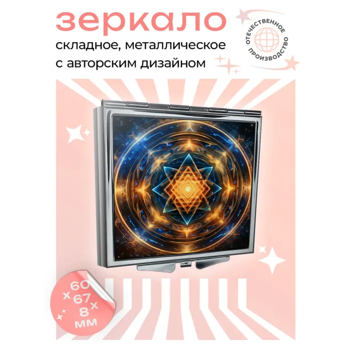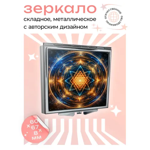 Складное квадратное зеркало с изображением в стиле космической геометрии. Изготовлено из металла и стекла.