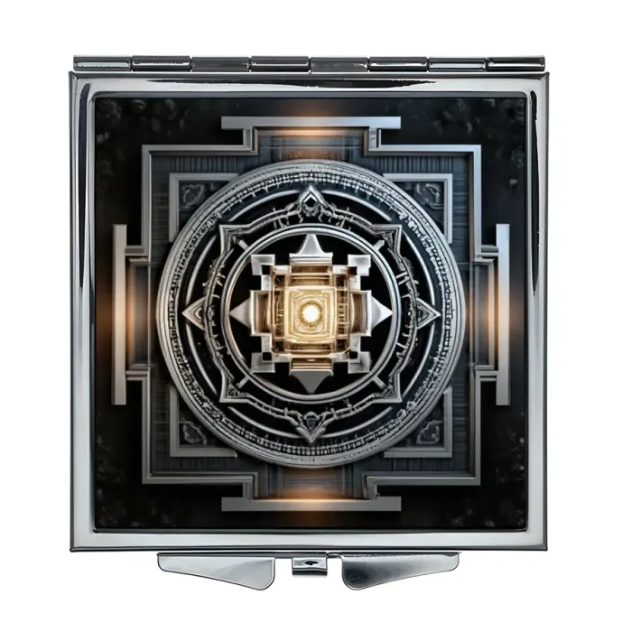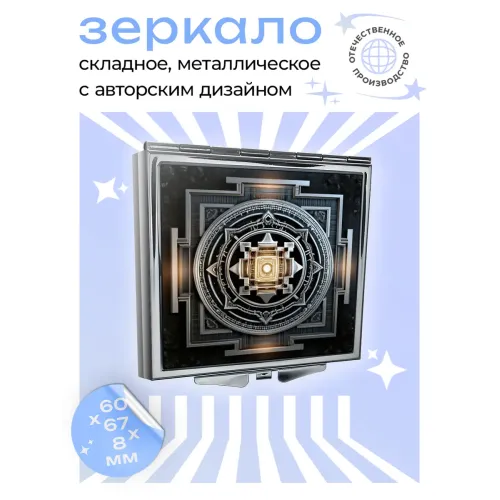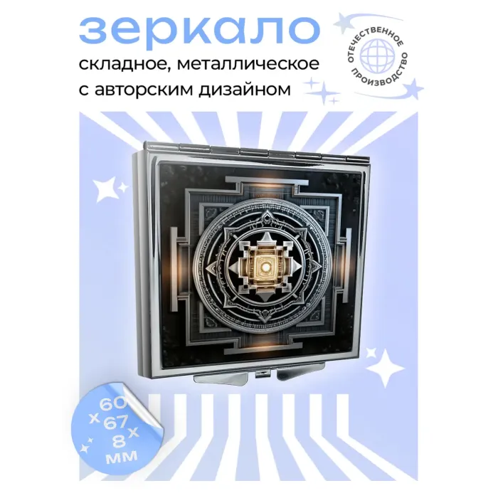 Складное зеркало квадратной формы с изображением мандалы. Изготовлено из металла и стекла с полноцветной печатью.