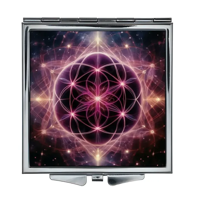 Складное зеркало квадратной формы с изображением «Космический цветок жизни». Изготовлено из металла и стекла.