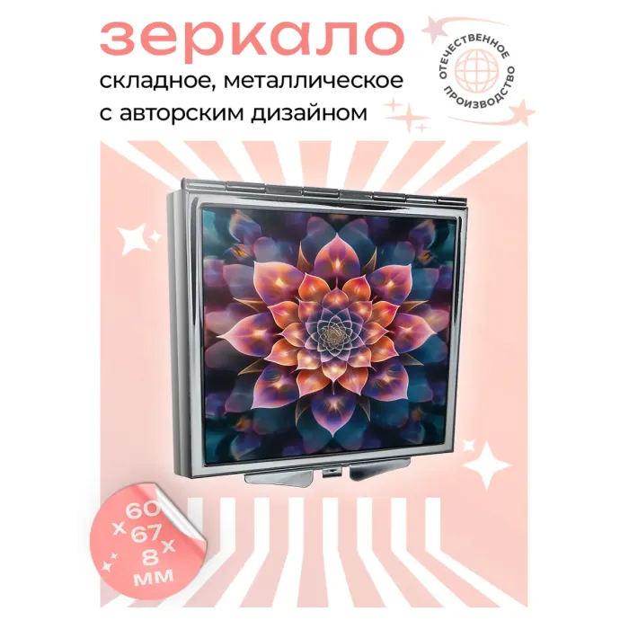 Складное зеркало квадратной формы с изображением цветка жизни. Изготовлено из металла и стекла.