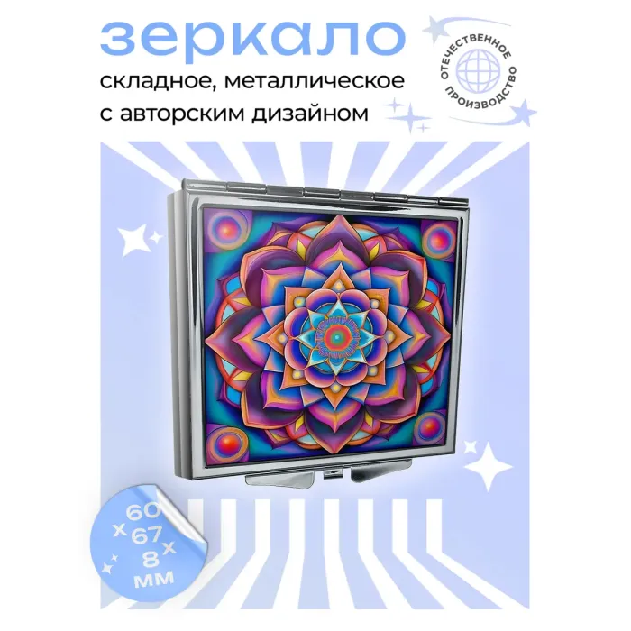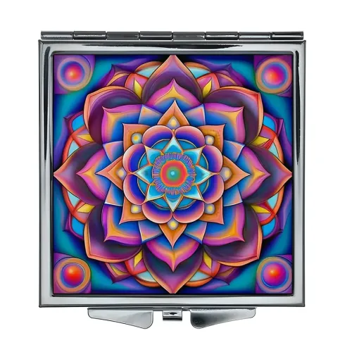 Складное зеркало квадратной формы с изображением мандалы. Материалы: металл и стекло.