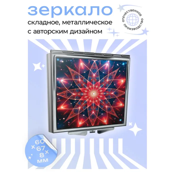 Складное зеркало квадратной формы с изображением Космического цветка жизни. Изготовлено из металла и стекла.
