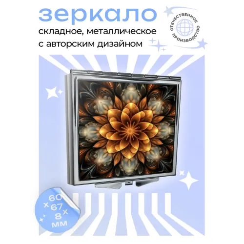 Складное зеркало квадратной формы с изображением Золотого цветка жизни. Изготовлено из металла и стекла.