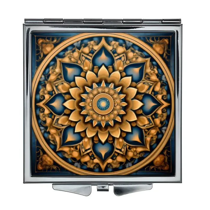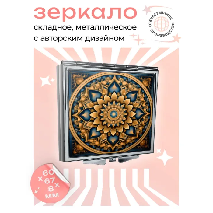Складное зеркало квадратной формы с изображением «Цветок жизни». Изготовлено из металла и стекла.