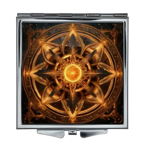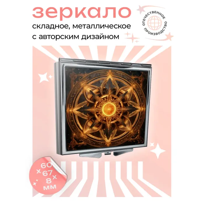 Складное зеркало квадратной формы из металла и стекла с полноцветным изображением «Золотой цветок жизни».