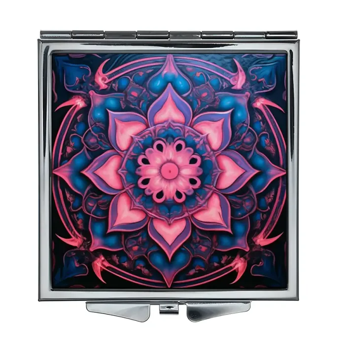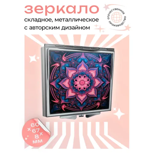 Складное зеркало квадратной формы для личного использования. Изготовлено из металла и стекла, украшено изображением розового цветка жизни.