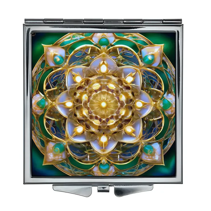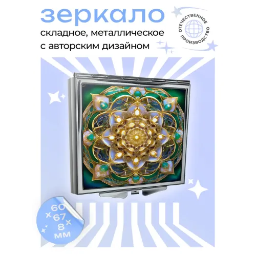 Складное зеркало квадратной формы с изображением «Золотой цветок жизни». Материал — металл и стекло.