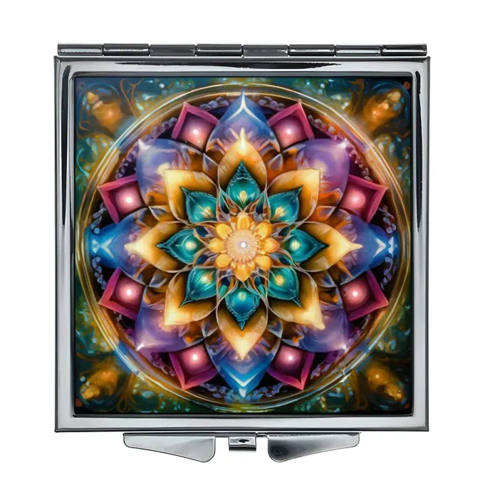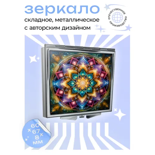 Складное зеркало квадратной формы с изображением цветка жизни. Материалы: металл и стекло.