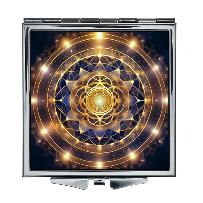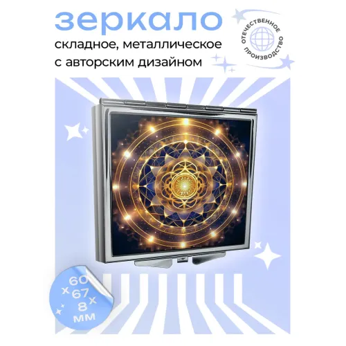 Складное зеркало квадратной формы с сакраментальным узором для личного использования.