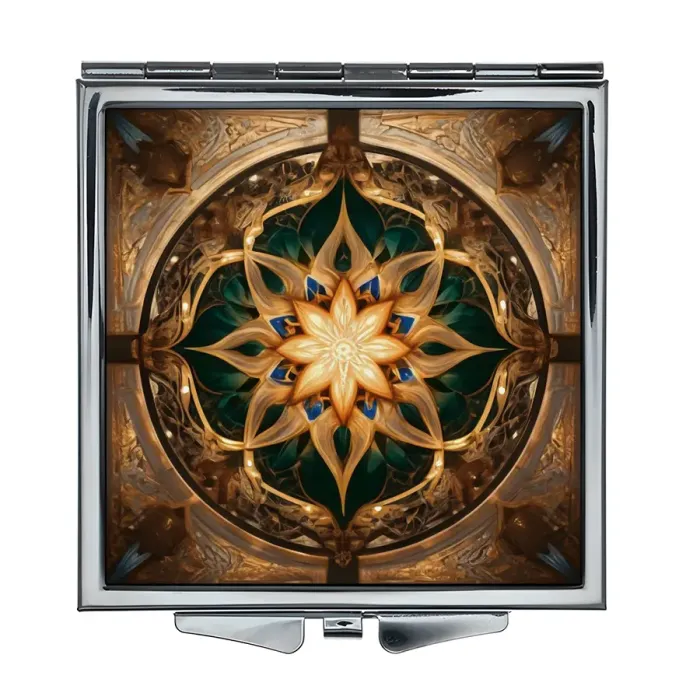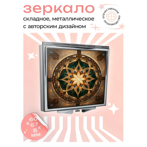 Складное зеркало квадратной формы с изображением восьмиконечного цветка.