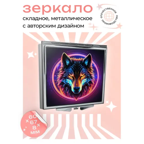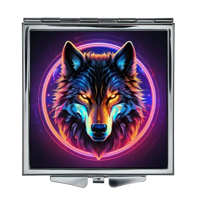Складное зеркало квадратной формы с изображением волка в неоновом стиле. Изготовлено из металла и стекла.