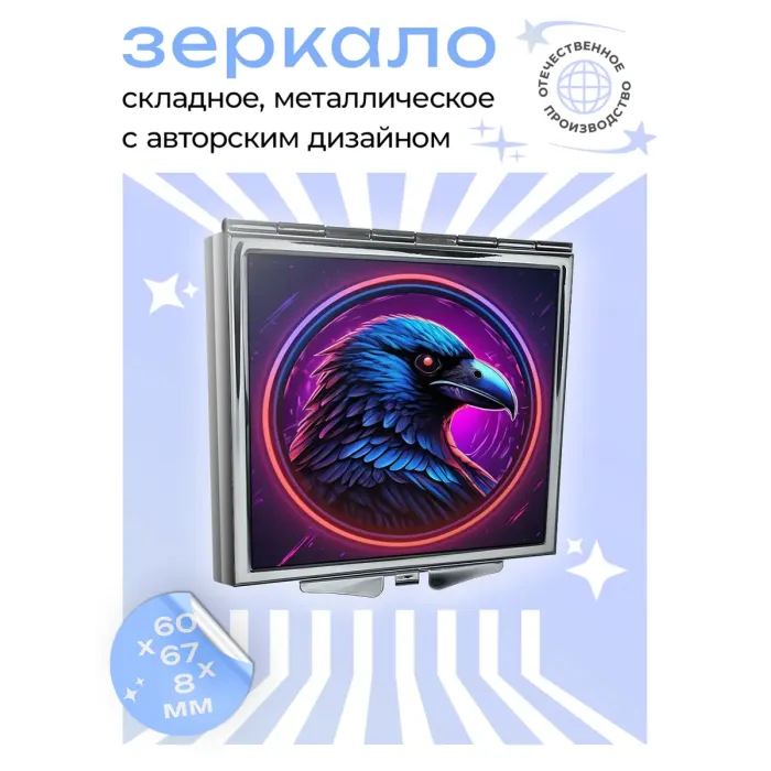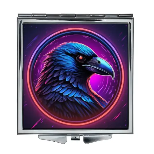 Складное зеркало квадратной формы с изображением ворона в неоновом стиле.