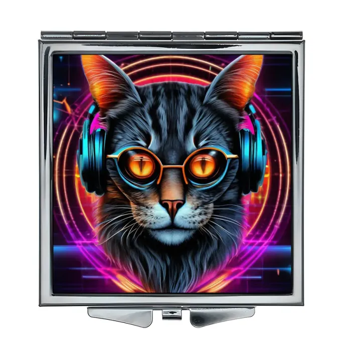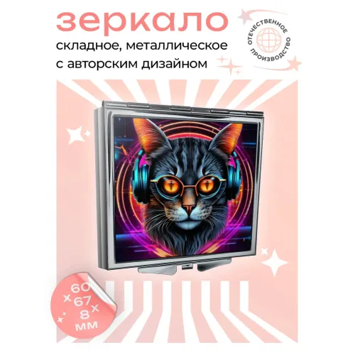 Складное квадратное зеркало с изображением кота в очках и наушниках.