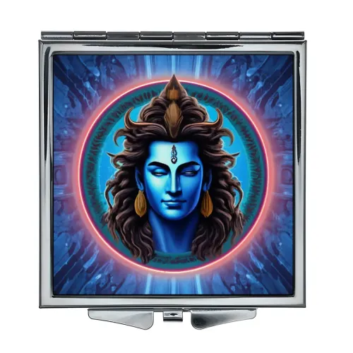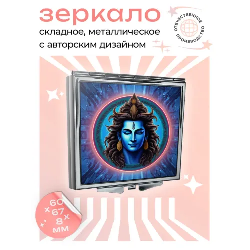 Складное зеркало квадратной формы с изображением Шивы. Изготовлено из металла и стекла.