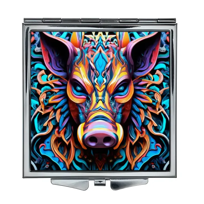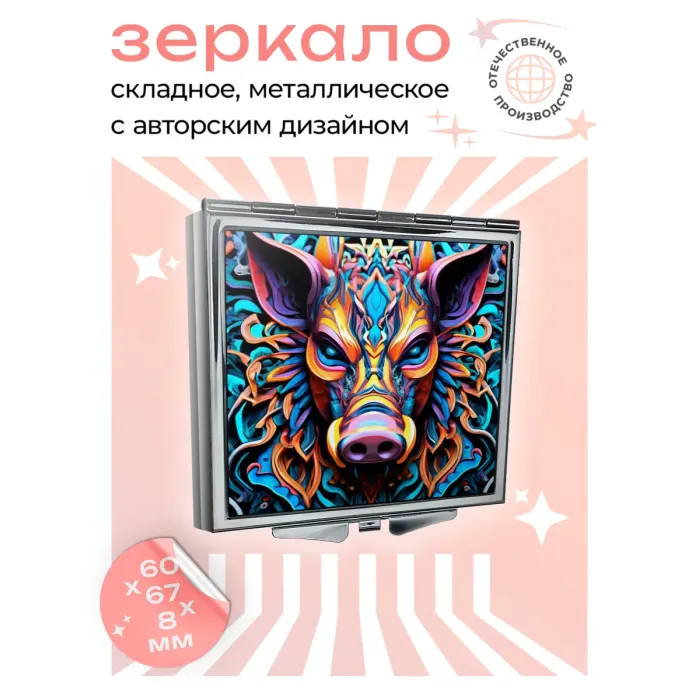 Складное зеркало квадратной формы с изображением кабана. Изготовлено из металла и стекла.