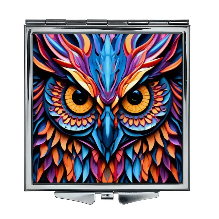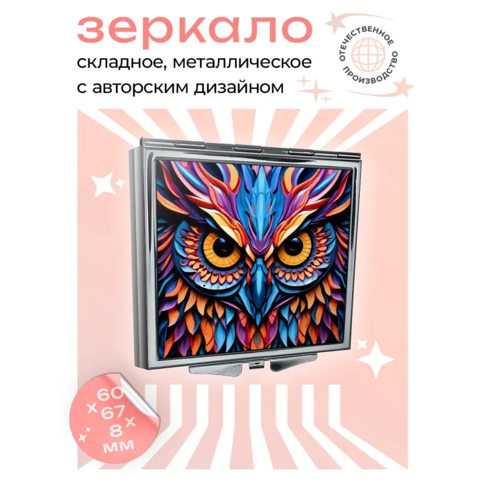 Складное зеркало квадратной формы с изображением совы. Изготовлено из металла и стекла.