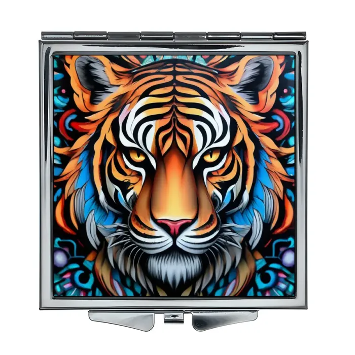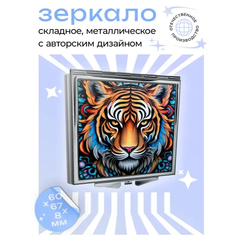 Складное квадратное зеркало с изображением тигра, изготовленное из металла и стекла.