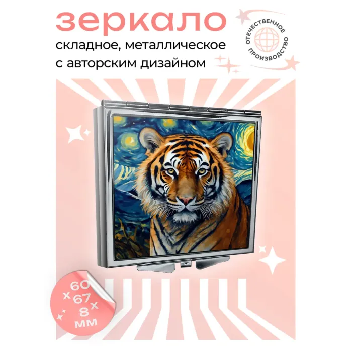 Складное квадратное зеркало с изображением тигра на фоне звездного неба. Изготовлено из металла и стекла.