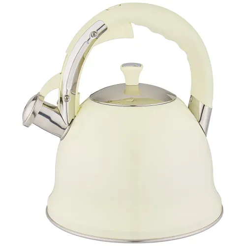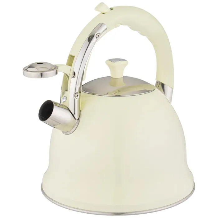 Корпус выполнен из нержавеющей стали, устойчивой к коррозии. Капсульное дно с алюминиевой прослойкой аккумулирует тепло для более эффективного и равномерного нагрева. Конструкция включает ручку, которая не нагревается в процессе эксплуатации, и свисток, сигнализирующий о закипании воды. Клапан на ручке облегчает процесс наливания.