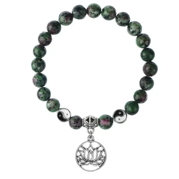 Браслет из синтетического камня цоизит с подвеской-талисманом в виде лотоса.
