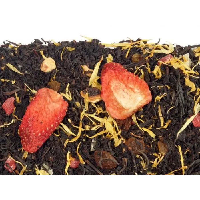 Состав: Чай чёрный листовой крупный, цукаты ананаса, изюм, лепестки календулы, слайсы клубники, кусочки яблока, ароматизаторы