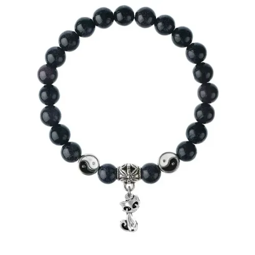 Браслет из синтетического синего авантюрина с подвеской в виде кошки из бижутерного сплава.