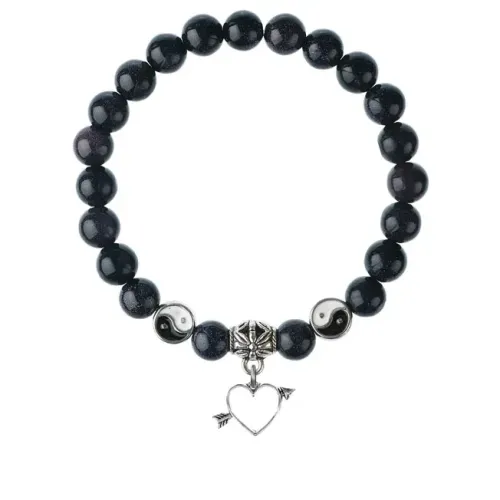 Браслет-амулет из синего авантюрина, имитирующего натуральный камень, с подвеской-талисманом из бижутерного сплава с покрытием под серебро. Этот браслет не только стильный аксессуар, но и символ любви и защиты. Внутренний диаметр составляет примерно 5,5 см, а диаметр каменных бусин — 8 мм.